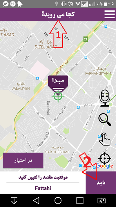 3- همچنین در صورتی که این امکان در موبایل شما باشد میتوانید مبدا و یا مقصدتان را با فشردن این دگمه به صورت صوتی درخواست کنید.