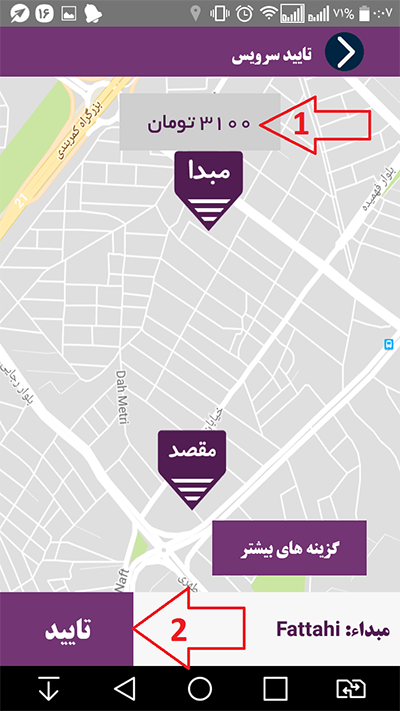 2- درصورتیکه از صحت مبدا و مقصد اطمینان دارید و قیمت تعیین شده کرایه را می پذیرید دگمه تایید را فشار دهید.