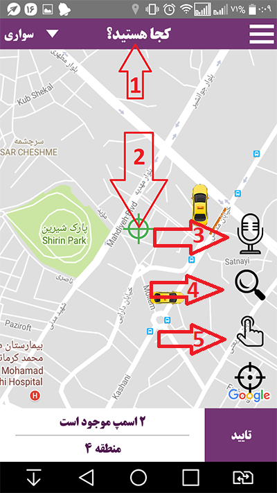 3- همچنین در صورتی که این امکان در موبایل شما باشد میتوانید مبدا و یا مقصدتان را با فشردن این دگمه به صورت صوتی درخواست کنید.