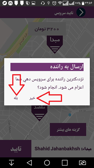در صورت اطمینان از کلیه انتخابهایتان میتوانید پاسخ "بله" را لمس کنید. با این انتخاب اطلاعات سفر شما برای نزدیکترین راننده به شما به صورت کاملا هوشمند ارسال خواهد شد.
